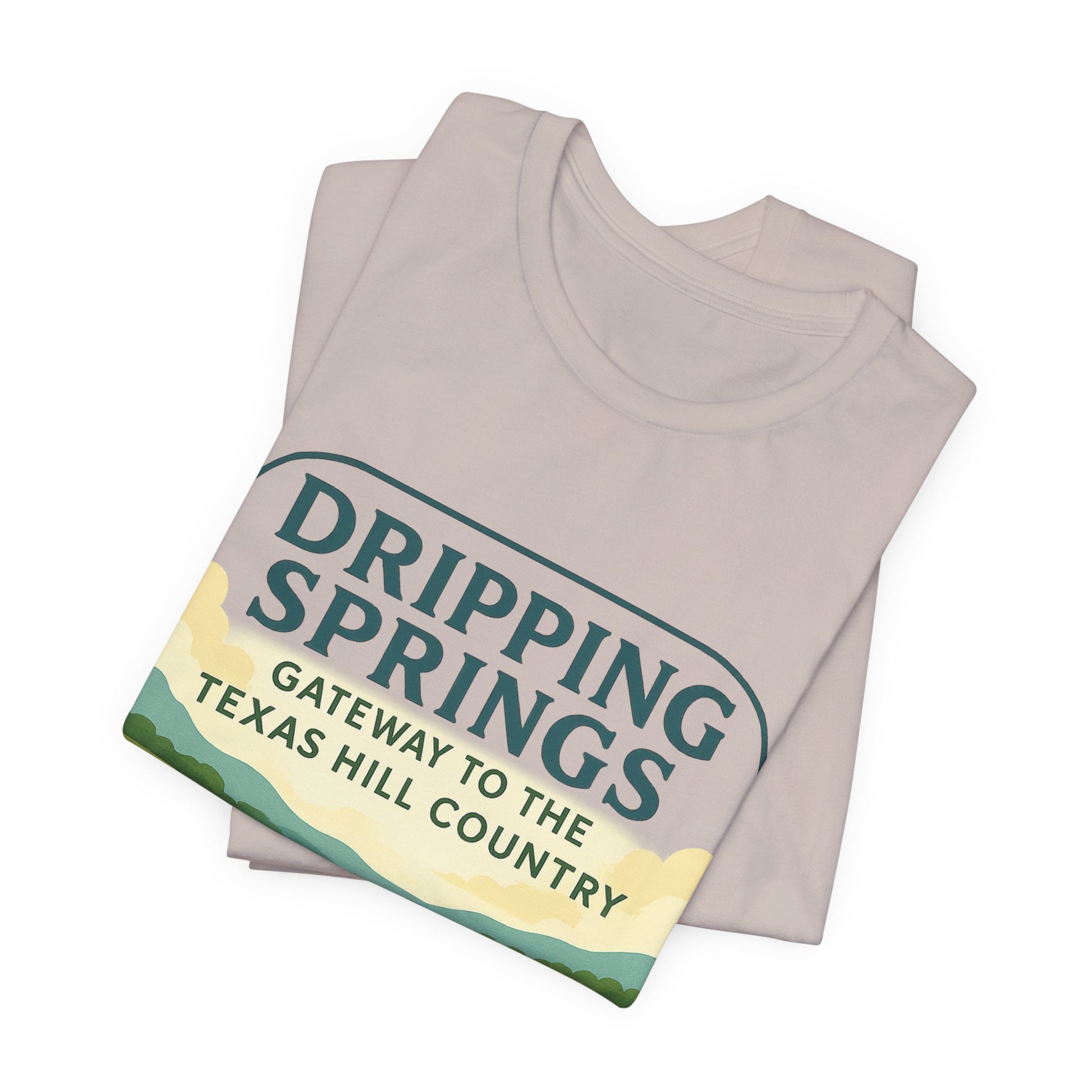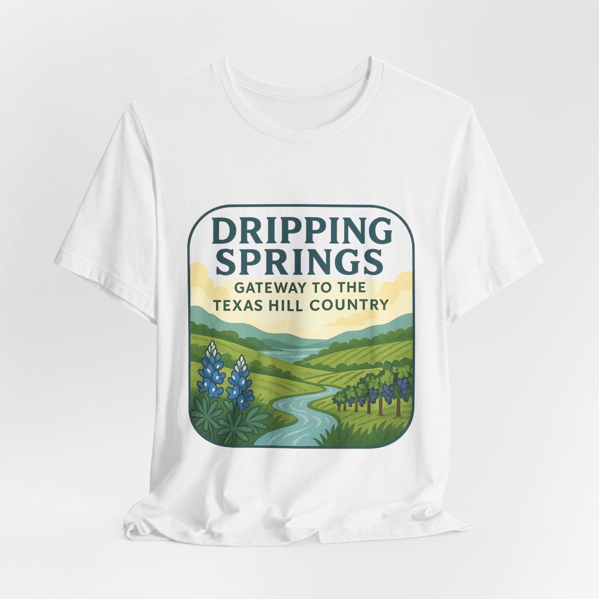 This soft, breathable tee carries the Dripping Springs Gateway to the Hill Country artwork like a quiet postcard you can wear. Lightweight Airlume cotton feels cool against the skin while the crew neckline and retail fit keep the silhouette clean and easy to layer. Picture winding country roads, live oaks, and limestone ledges — the shirt brings that slow, sunlit stretch of Texas into everyday moments. It sits naturally in the wardrobe of folks who live for weekend drives, farmers market stops, and evenings on a back porch. The printed sleeve and subtle neck label add thoughtful detail without shouting, and the tear-away label keeps comfort uninterrupted. Thoughtfully made and responsibly produced, this tee is built to keep its shape and color through many seasons of being worn and loved.