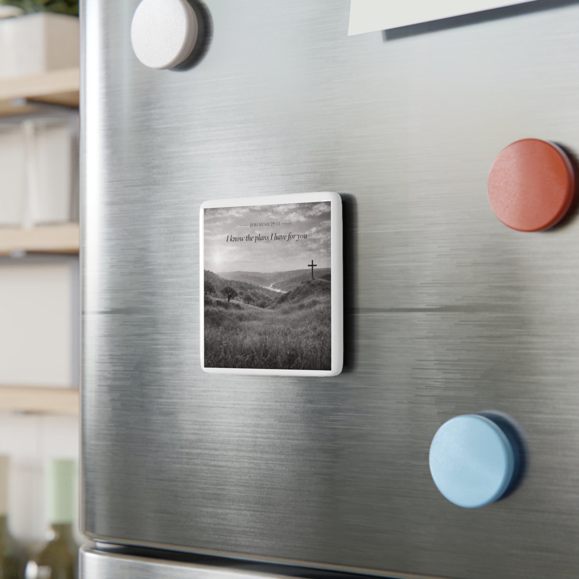 A quiet, faith-filled porcelain magnet that settles onto your fridge like a small moment of calm. The 2" glossy square holds a soft grayscale landscape — rolling hills, a distant cross, and the gentle words "I know the plans I have for you" — offering a daily breath of reassurance.